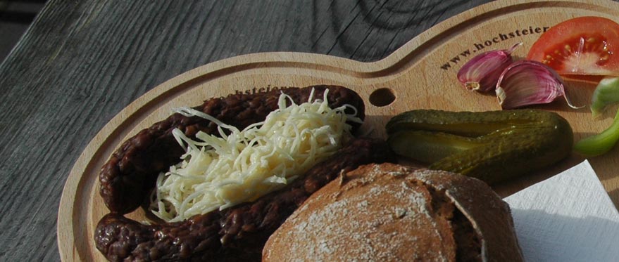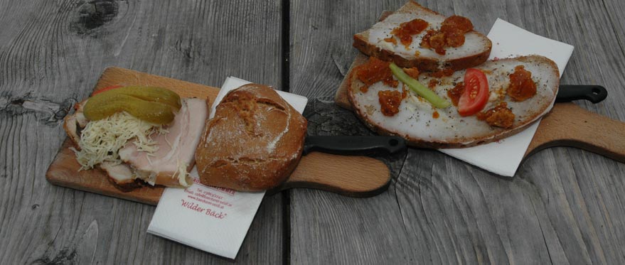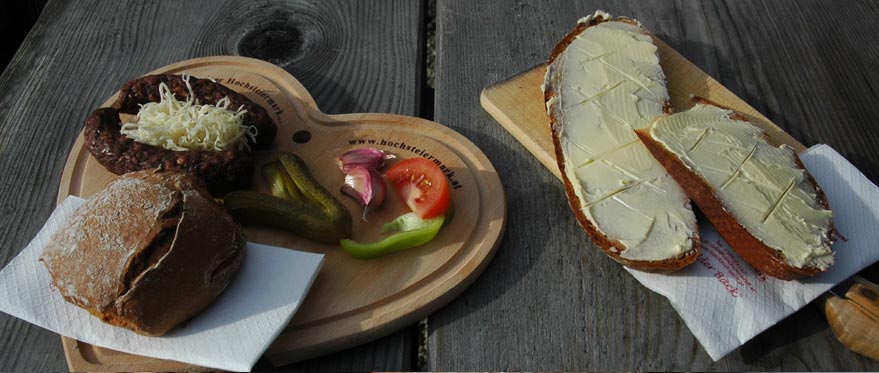 Kalte Jause gibt's immer, verschiedene Jausenbrettln und ganz neu in Verbindung mit dem Wildtiermuseum, gibt's auch eine Hirschwurst.